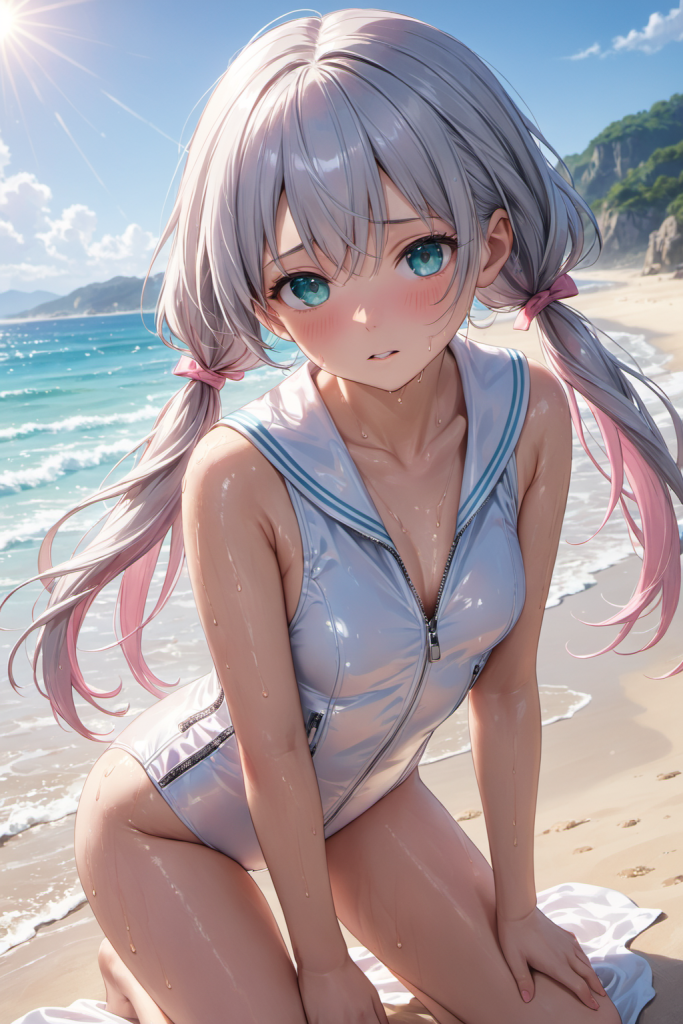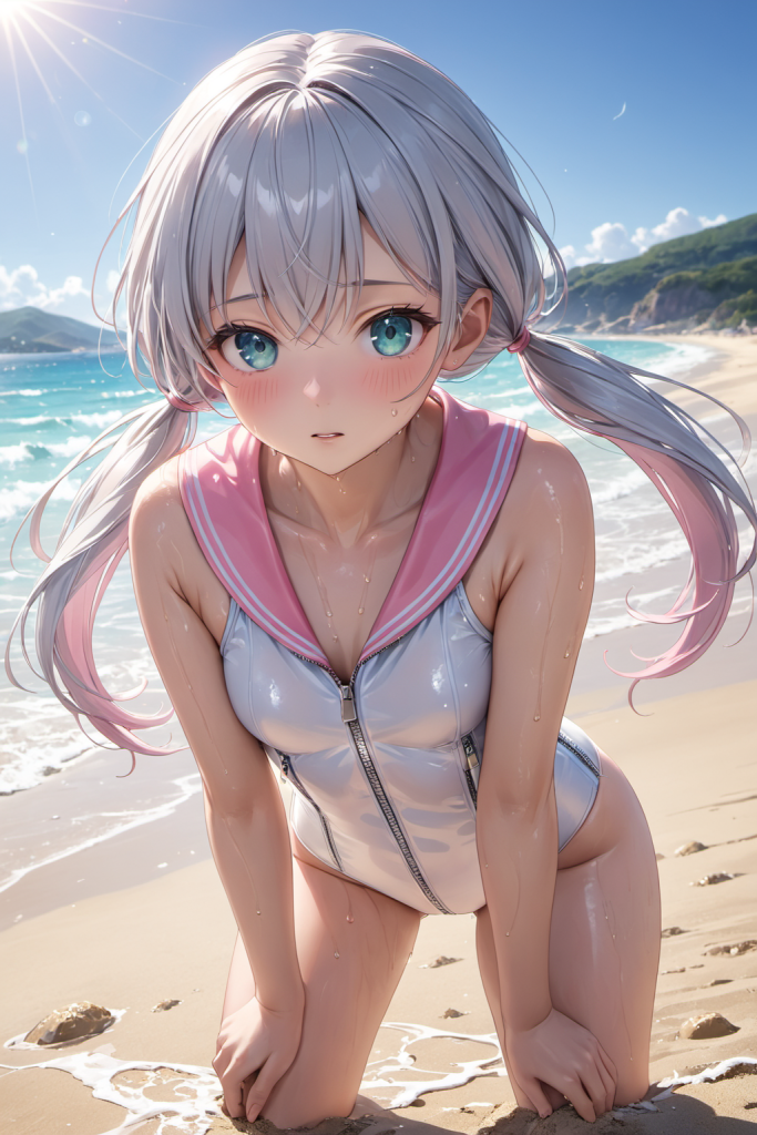 フロントジッパー付き白セーラー水着で少し照れるさみさん。下部のプロンプトラベルがデザインアーカイブであることを示している。