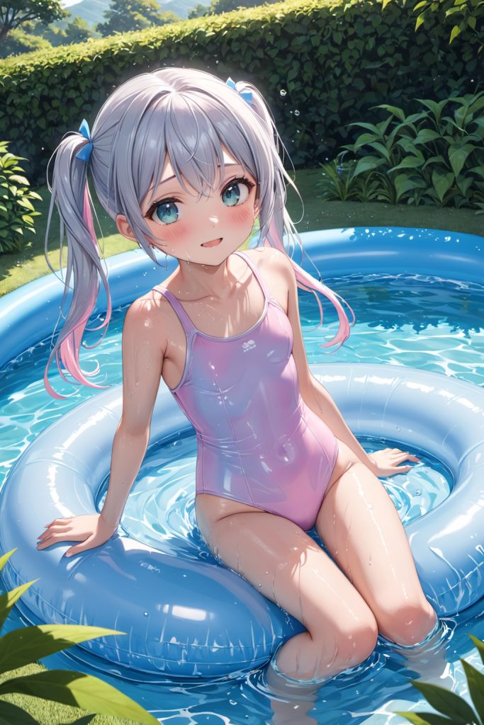 ピンクのスクール水着でビニールプール遊び中。下部のプロンプトラベルがデザインアーカイブであることを示している。