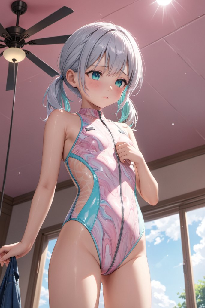 ピンクマーブル模様のフロントジッパー水着を着たさみさん。下部のプロンプトラベルがデザインアーカイブであることを示している。