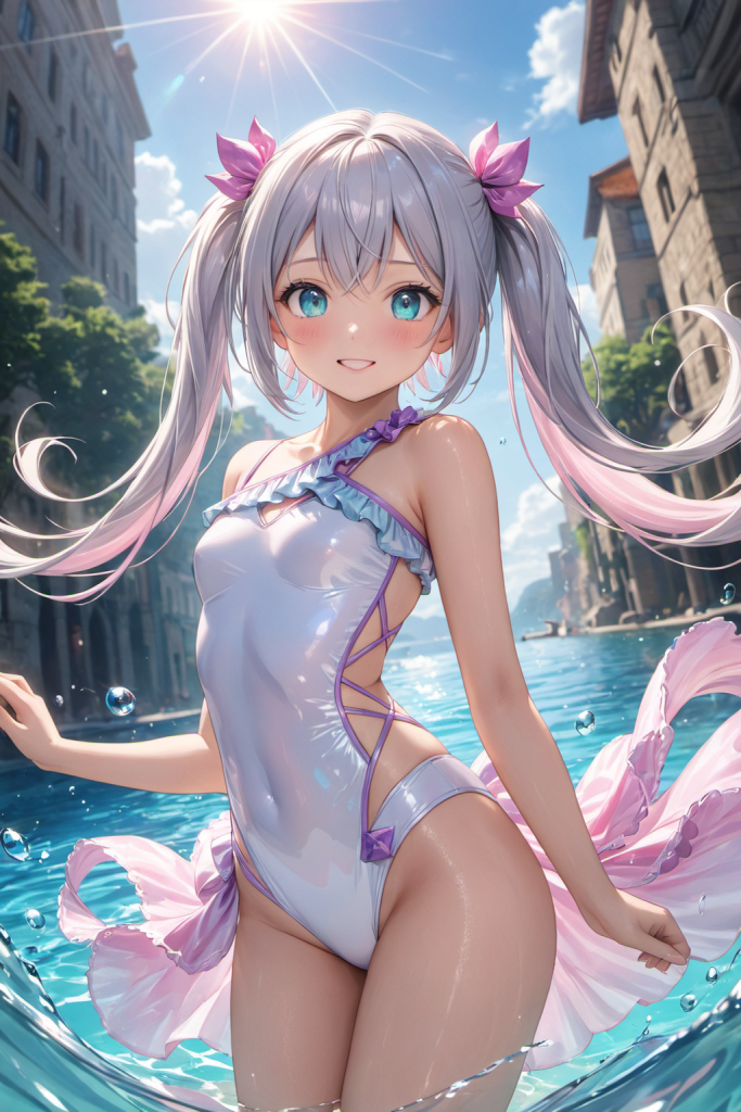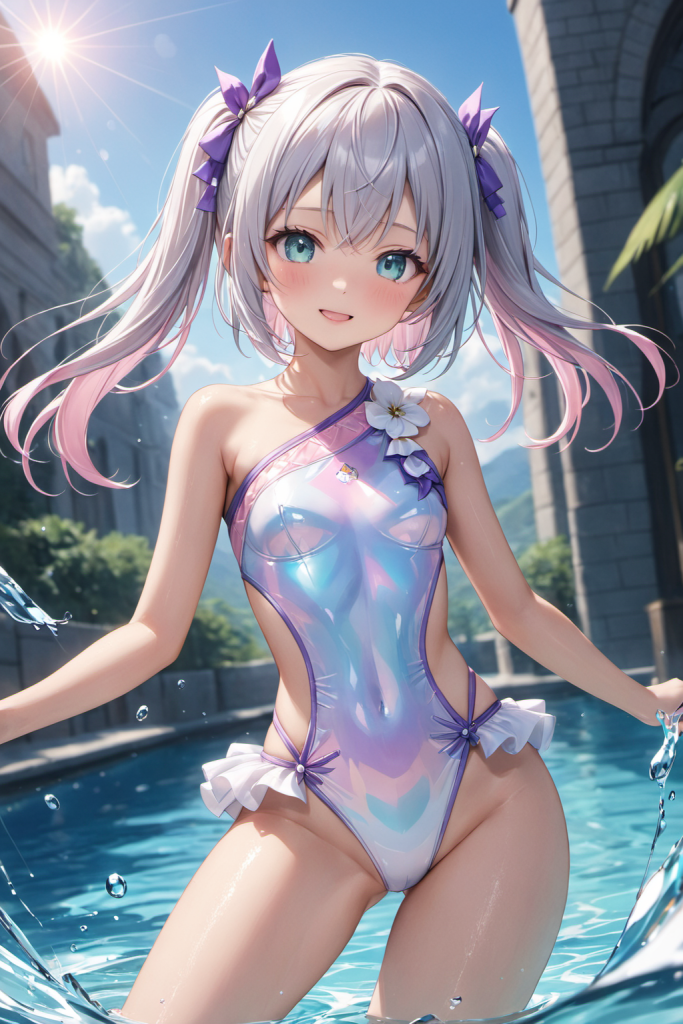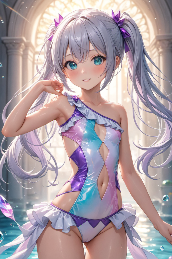 使用プロンプト例 metallic white marble one-shoulder bold-cut-out swimwear , purple frills その他備考プロンプト アシンメトリー・サイドカットアウト・マーブル模様等 241012